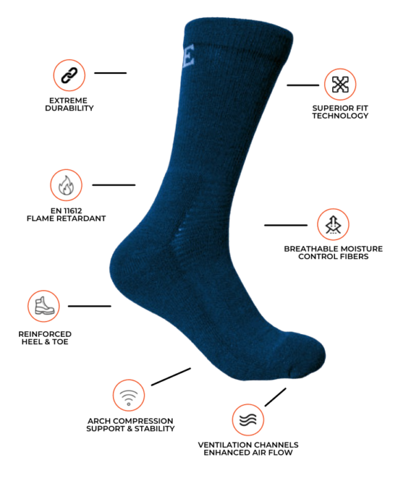 Týr is Navy Blue and knitted of wool 34%, Lenzing FR® 34% and Kermel® 17%, with reinforcements in polyamide. This combination of fabrics gives high ignition temperature, does not melt or drip and forms a self-insulating char that prevents further flame spread.